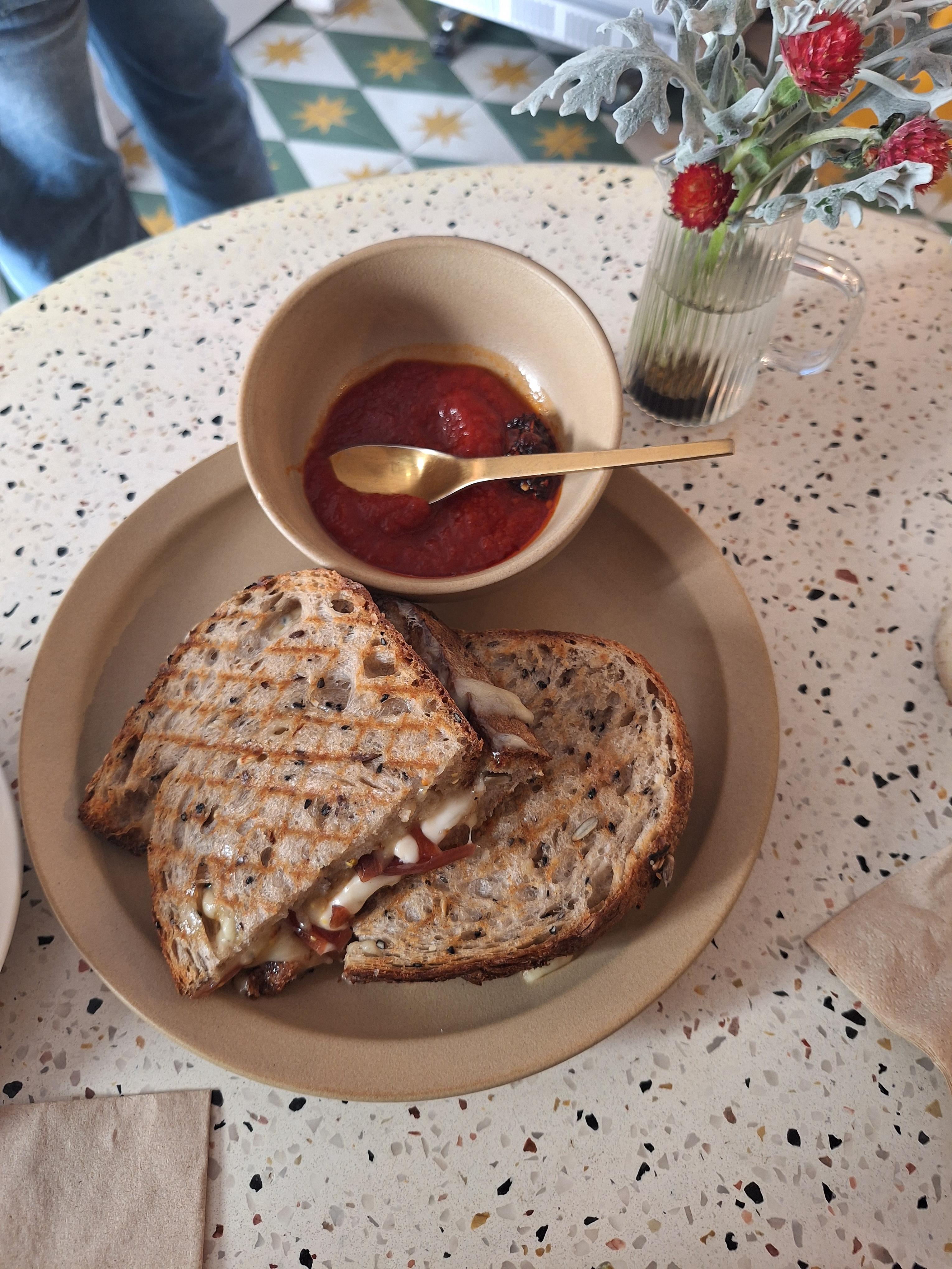 특히 멜티드 치즈 토스트에 저 토마토소스가 감칠맛이 있게 맛있어서 좋았어요.