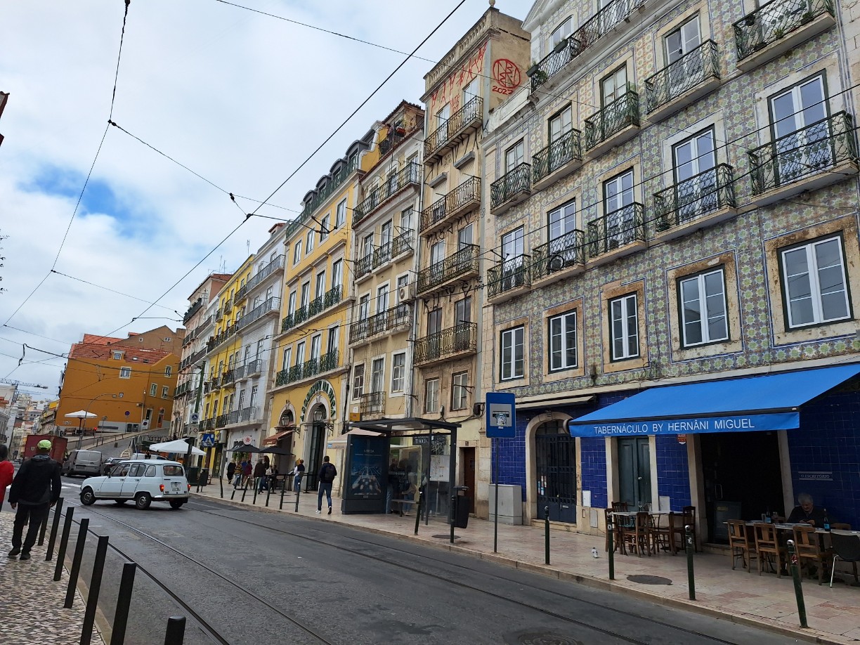 리스본에는 트램이 곳곳을 누비고 다니기 때문에 저런 철길이 도로에 공존합니다.