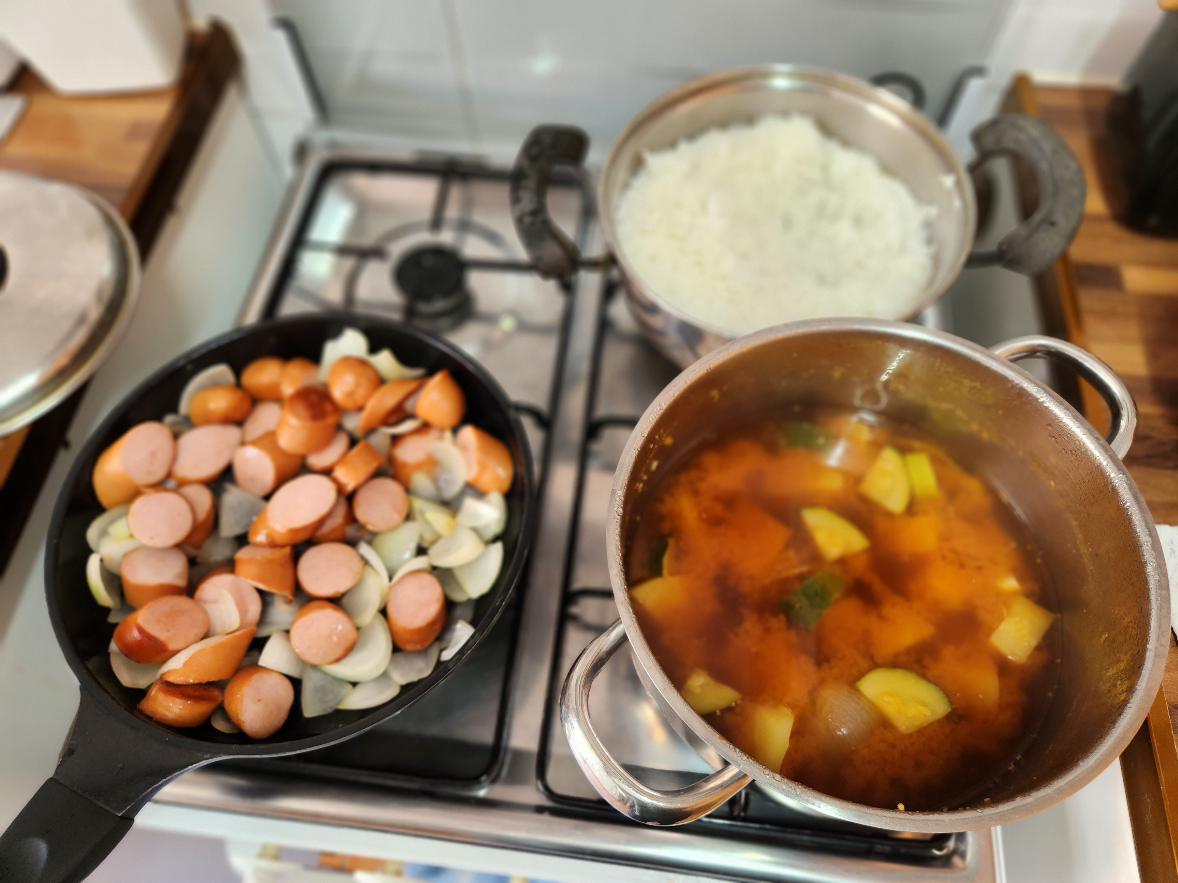 이조합도 정말로 내가 좋아하는 조합이다. 포르투갈감자는 여러 종이 있지만 자갈돌같이 동글동글한 것이 있다. 그 감자를 포르투갈인들은 주식처럼 식사에 곁들이는데 그냥 쪄먹어도 맛있다. 그래서 감자와 애호박 그리고 양파를 사서 쌈장으로 된장찌개를 끓이고 소세지와 양파로 밑반찬을 만들었다. 여기서는 삼겹살이 500그램에 채 10유로가 넘지 않는 저렴한 가격이라서 가끔 구워 먹기도 하고 쌈장을 발라서 수육을 해먹기도 했다. 하지만 큰 마트에서만 팔기 때문에 삼겹살을 못산 날은 소세지로 대신해서 양상추랑 쌈을 해 먹었다. 쌈장을 바르면 양상추도 상추랑 비슷해진다.