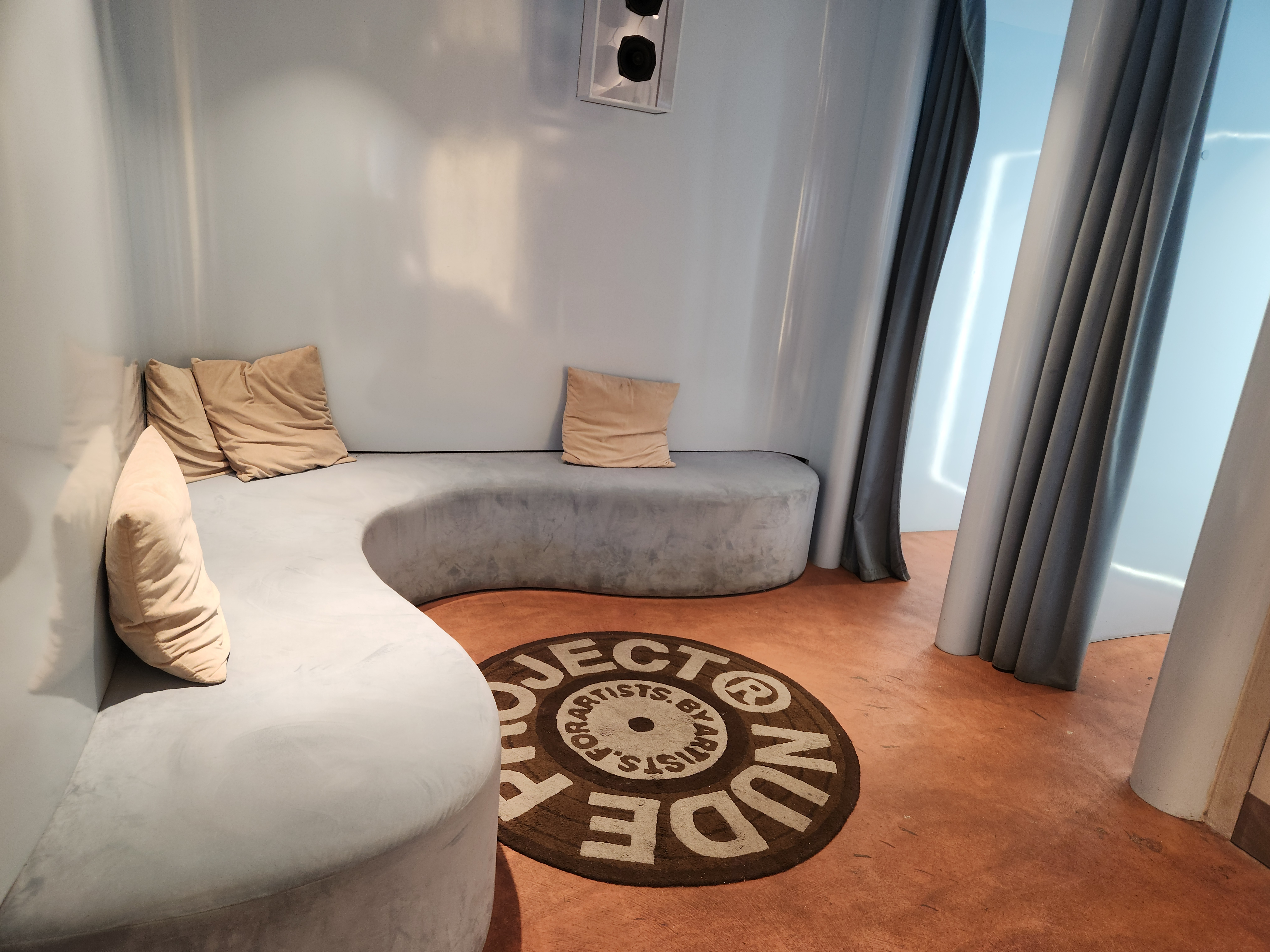 - 벽면에는 Nude Project 특유의 감각적인 포스터와 네온사인