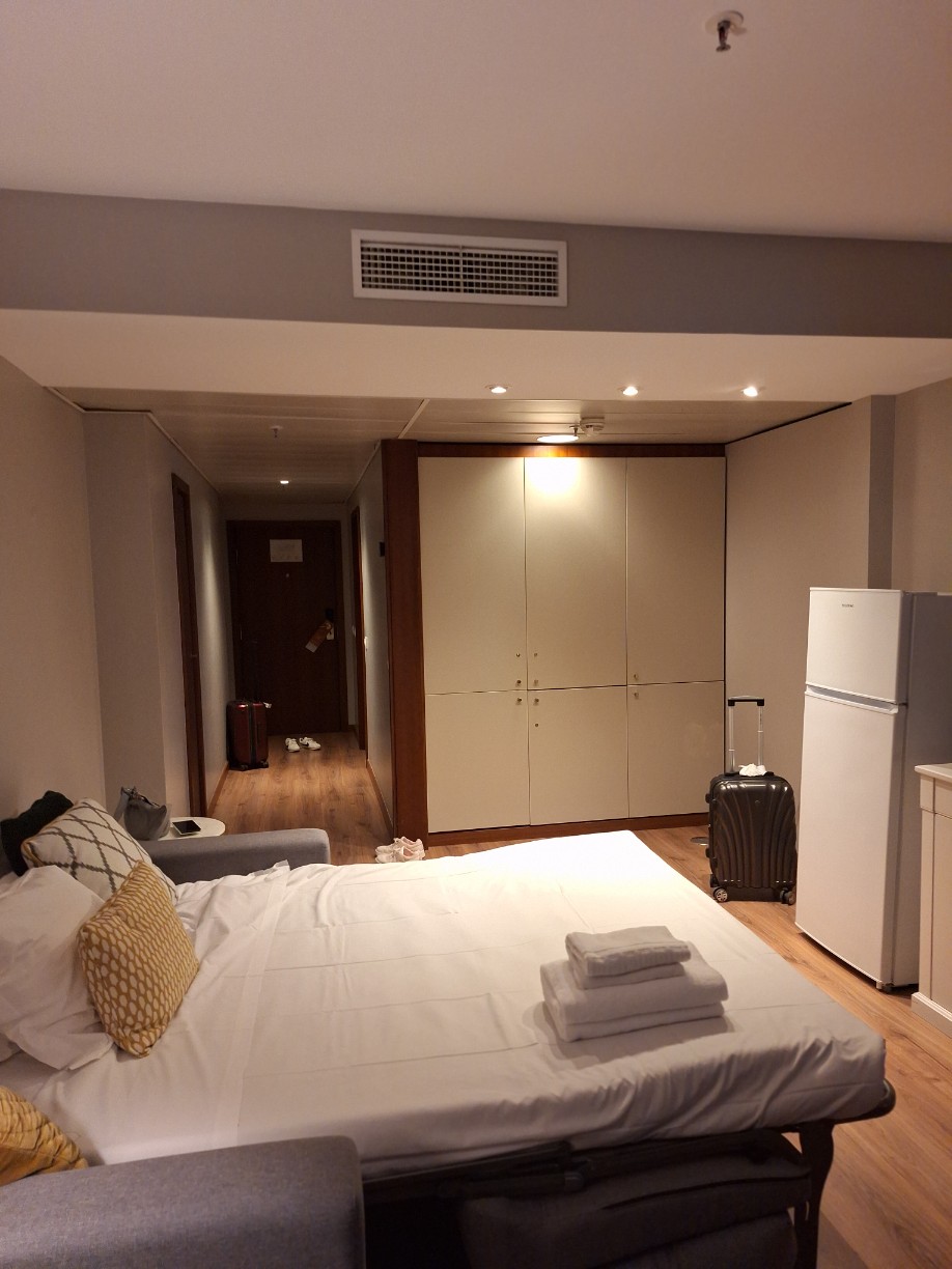 방과 거실로 구성이 되어 있는 구조인데 굉장히 넓어서 놀랐네요. 호텔룸에 비하면 공간이 넉넉해서 세 명이 지내기 충분해요.